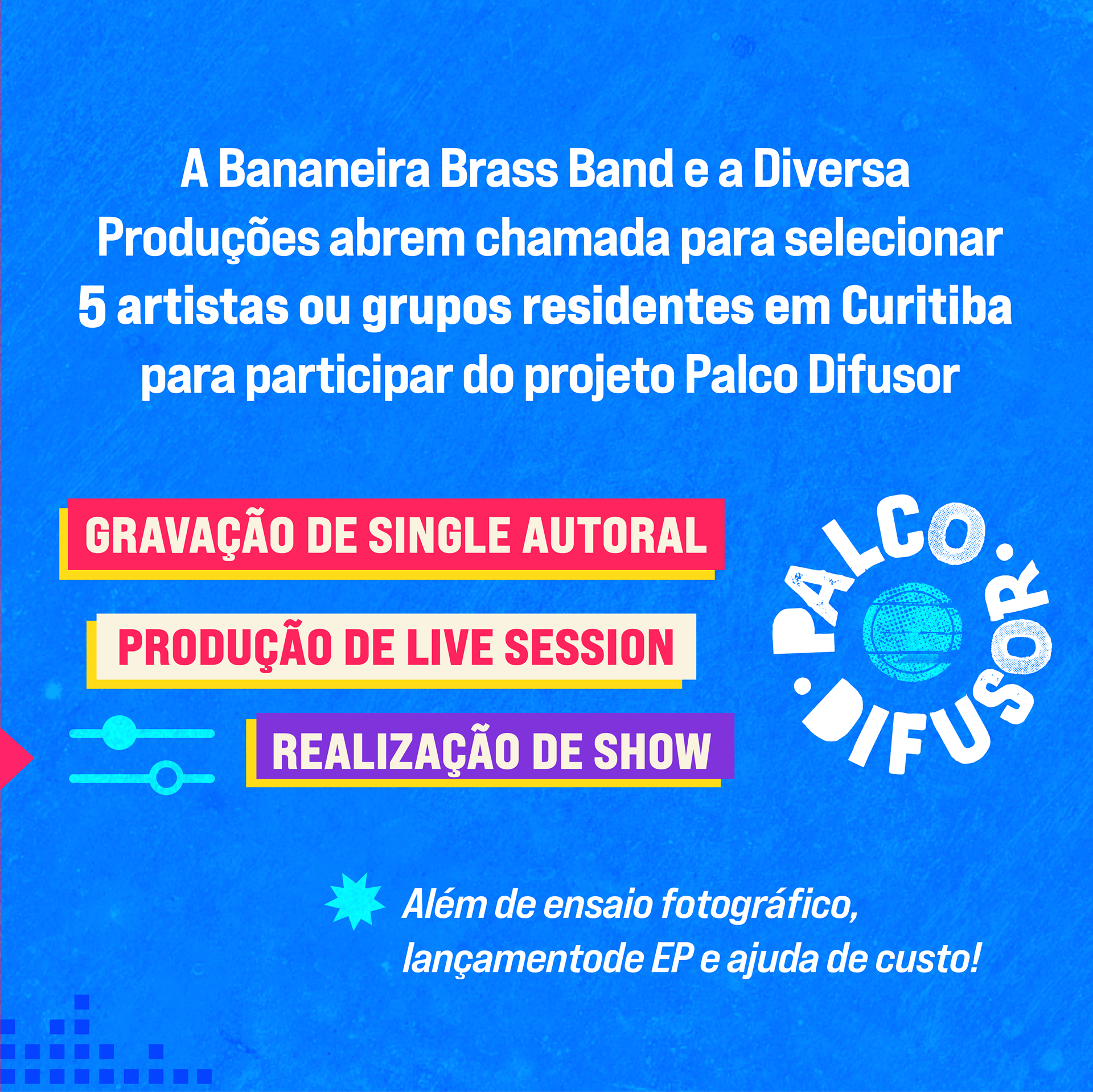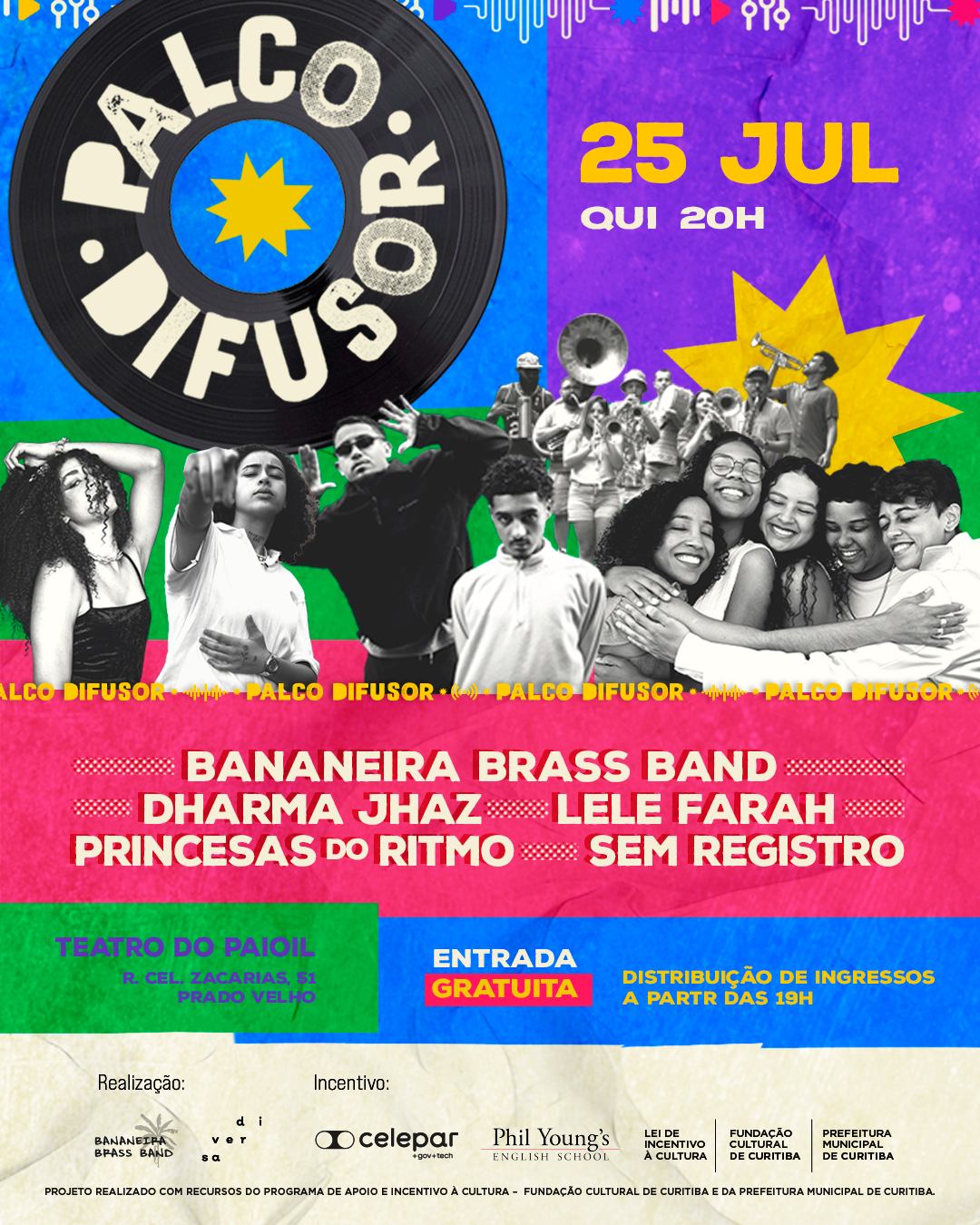 A iniciativa promoveu uma imersão em produção musical com cinco artistas independentes de regiões descentralizadas de Curitiba, selecionados por edital público. Ao longo de meses de vivência prática e criativa, os artistas participaram de residências, gravações no Estúdio Aroeira e processos colaborativos ao lado do coletivo. O encerramento aconteceu em grande estilo no Teatro do Paiol, com entrada franca e lançamento do EP com músicas inéditas criadas durante o percurso. Mais do que um show, o Palco Difusor afirma o compromisso com a descentralização cultural, a valorização da criação autoral e a potência de encontros artísticos mediados pela escuta e pelo território.